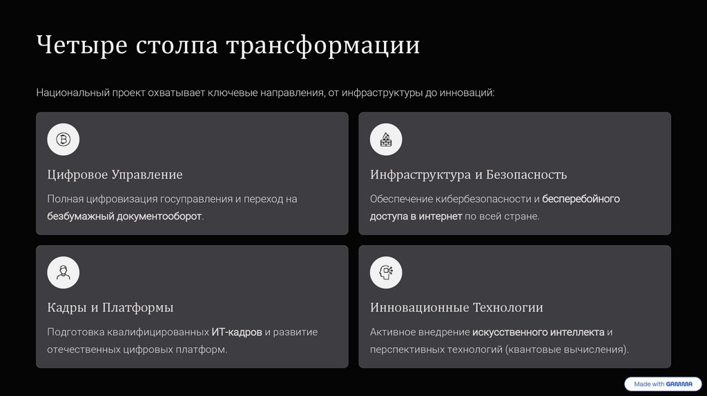 Четыре столпа трансформацииНациональный проект охватывает ключевые направления, от инфраструктуры до инноваций: