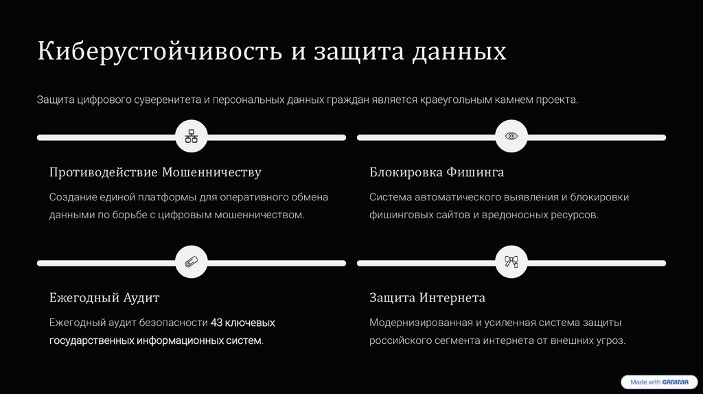 Киберустойчивость и защита данныхЗащита цифрового суверенитета и персональных данных граждан является краеугольным камнем проекта.