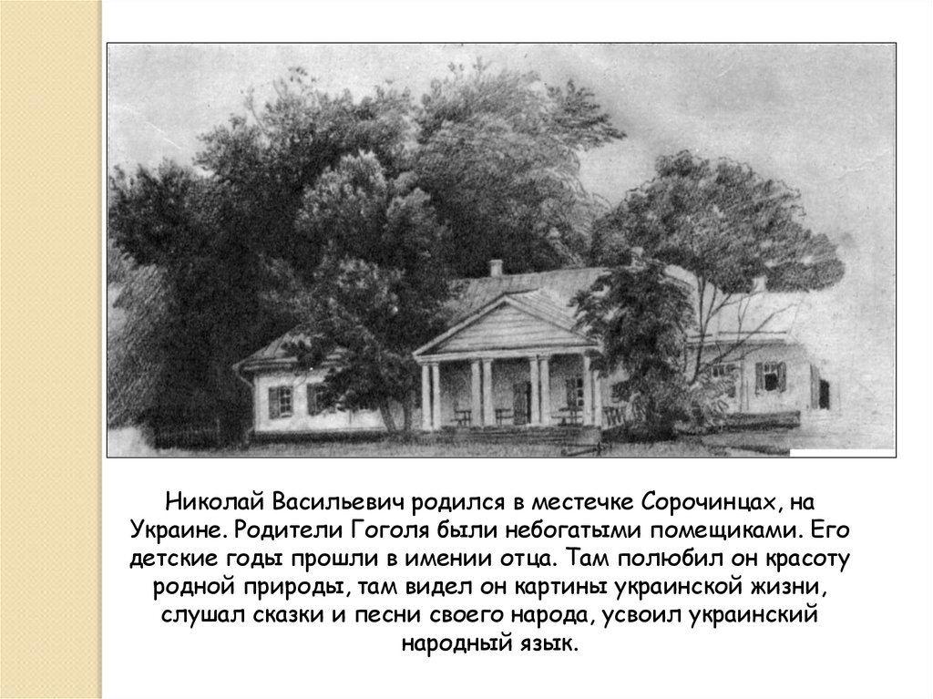 Николай Васильевич родился в местечке Сорочинцах, наУкраине. Родители Гоголя были небогатыми помещиками. Его