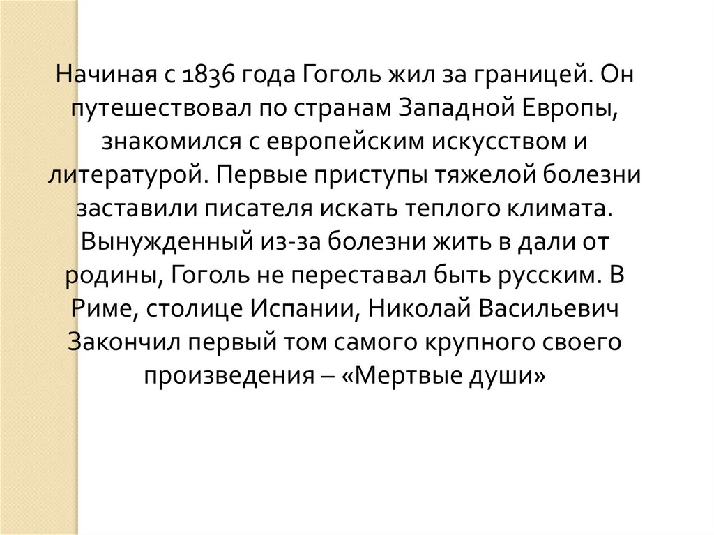 Начиная с 1836 года Гоголь жил за границей. Онпутешествовал по странам Западной Европы,