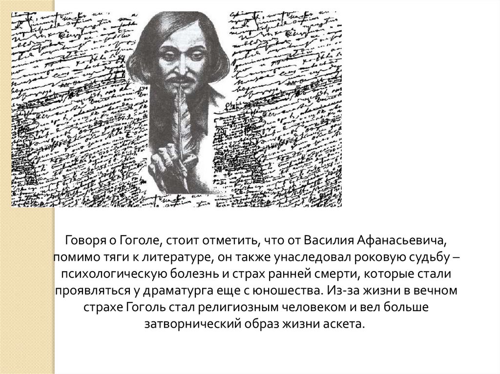 Говоря о Гоголе, стоит отметить, что от Василия Афанасьевича,помимо тяги к литературе, он также унаследовал роковую судьбу –