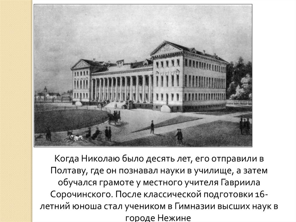 Когда Николаю было десять лет, его отправили вПолтаву, где он познавал науки в училище, а затем