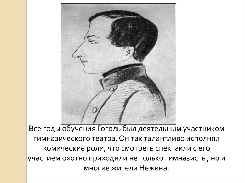 Все годы обучения Гоголь был деятельным участникомгимназического театра. Он так талантливо исполнял