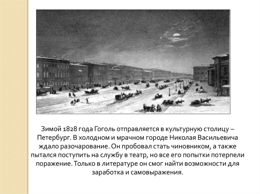 Зимой 1828 года Гоголь отправляется в культурную столицу –Петербург. В холодном и мрачном городе Николая Васильевича