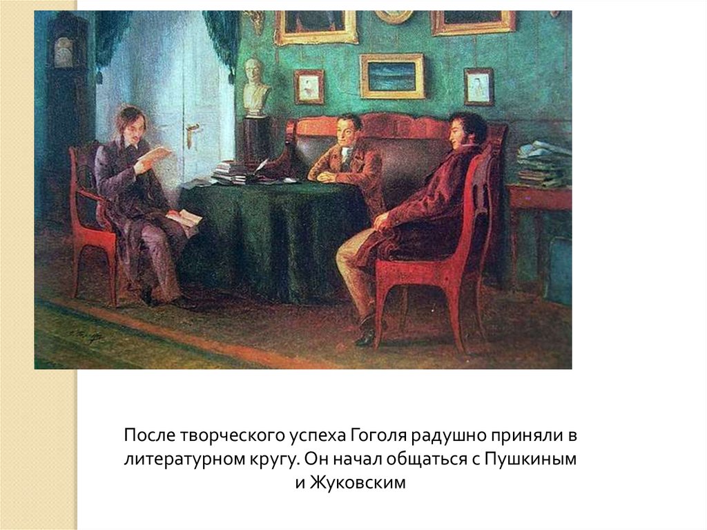 После творческого успеха Гоголя радушно приняли влитературном кругу. Он начал общаться с Пушкиным