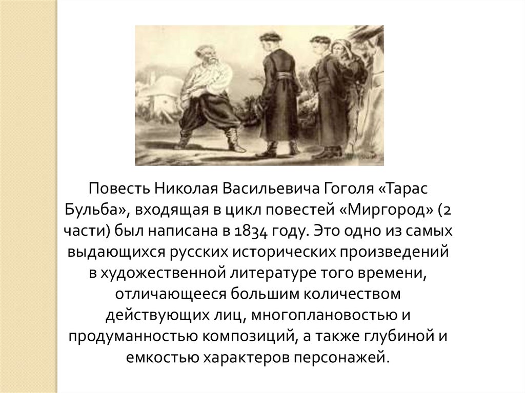 О произведенииПовесть Гоголя «Тарас Бульба» входит в цикл «Миргород».
