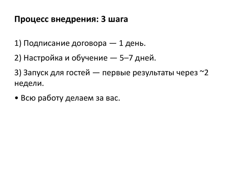 Процесс внедрения: 3 шага1) Подписание договора — 1 день.