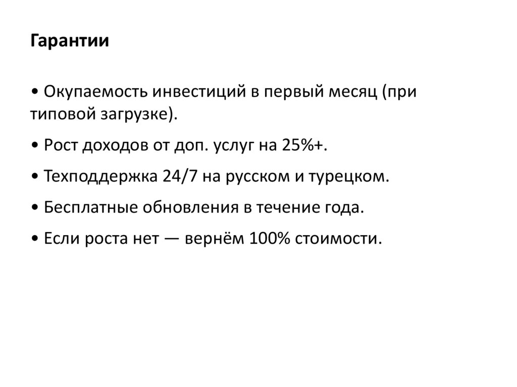 Гарантии• Окупаемость инвестиций в первый месяц (при