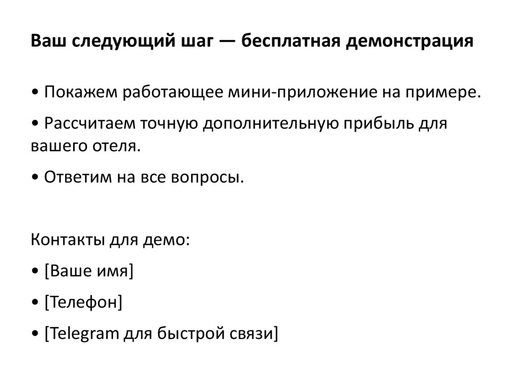 Готовы к демо? Свяжитесь с нами:[Ваше имя] · [Телефон] · [Telegram]