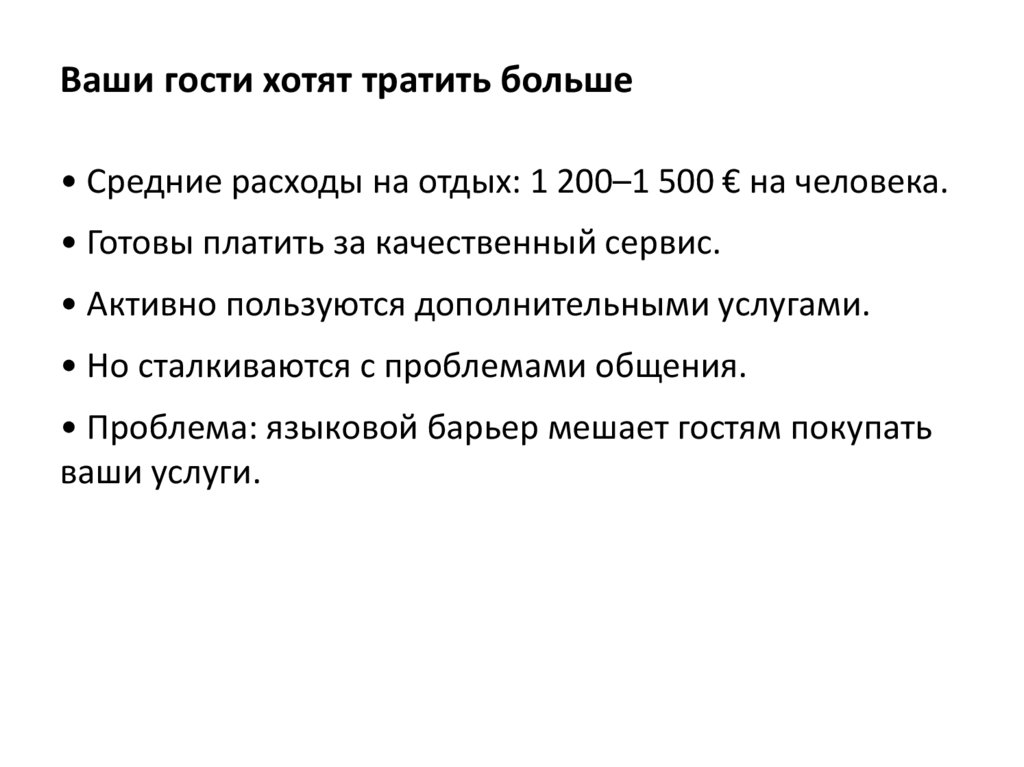Ваши гости хотят тратить больше• Средние расходы на отдых: 1 200–1 500 € на человека.