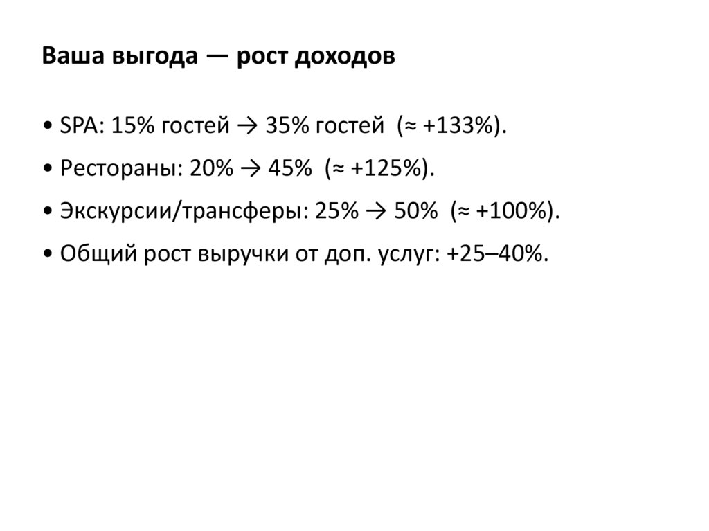 Ваша выгода — рост доходов• SPA: 15% гостей → 35% гостей (≈ +133%).