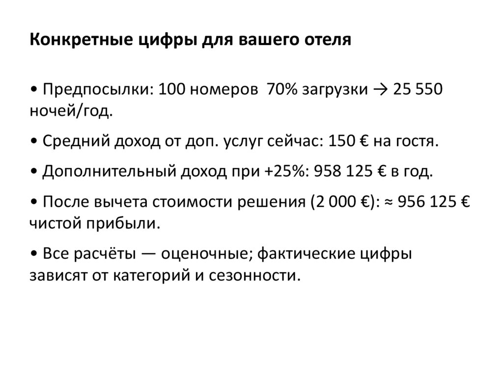 Конкретные цифры для вашего отеля• Предпосылки: 100 номеров 70% загрузки → 25 550
