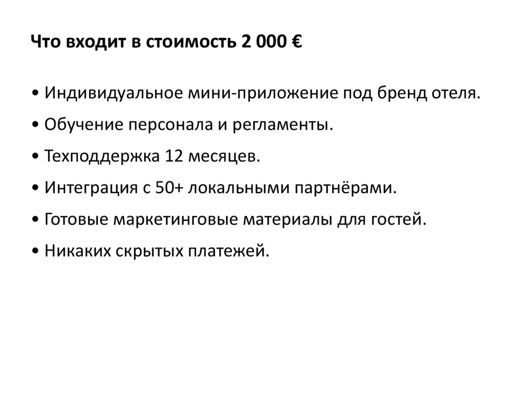 Что входит в стоимость 2 000 €• Индивидуальное мини-приложение под бренд отеля.