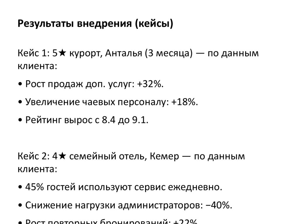 Результаты внедрения (кейсы)Кейс 1: 5★ курорт, Анталья (3 месяца) — по данным