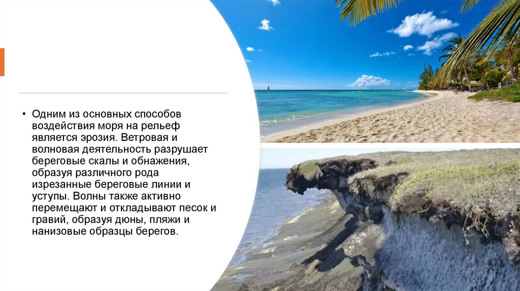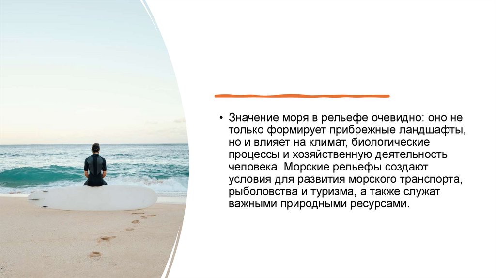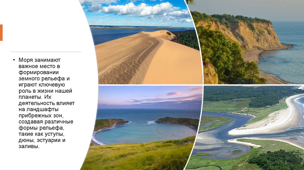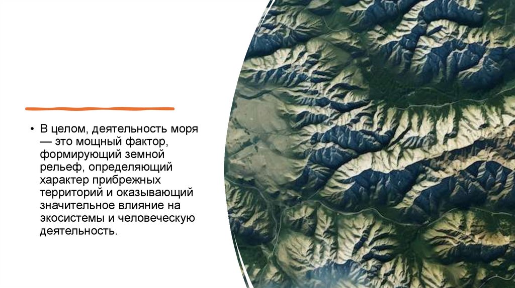 • Значение моря в рельефе очевидно: оно нетолько формирует прибрежные ландшафты,