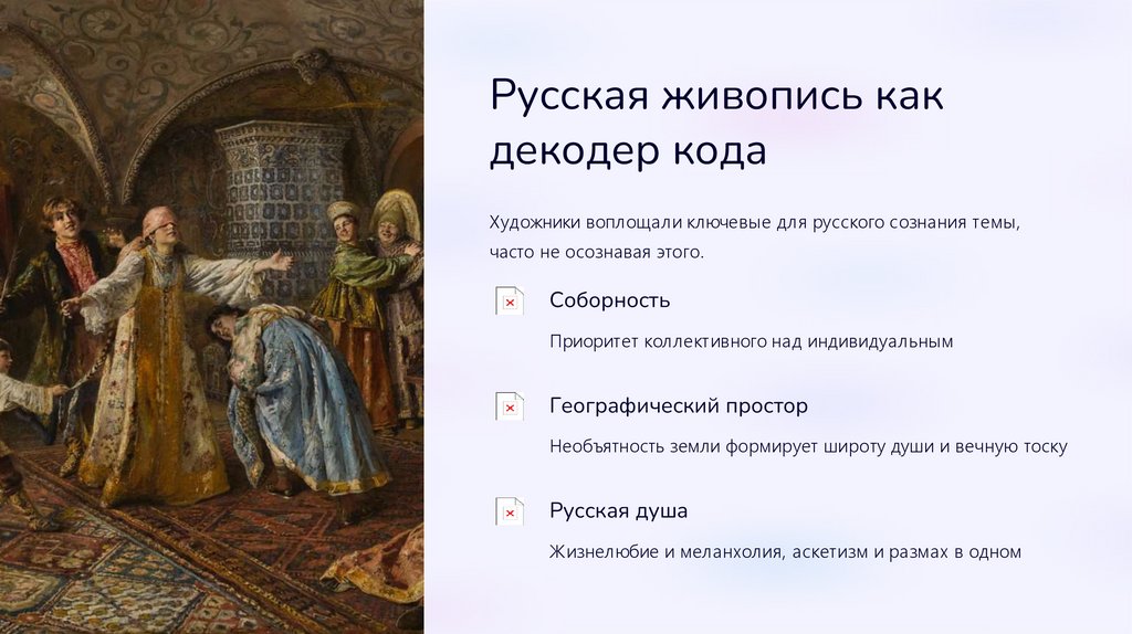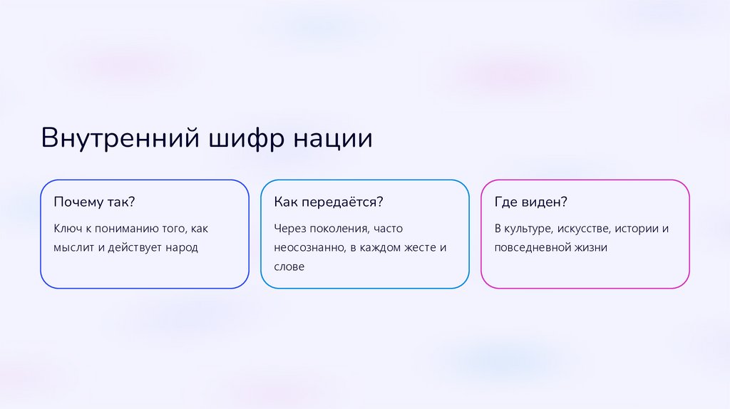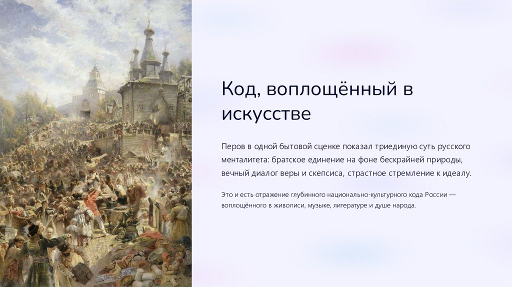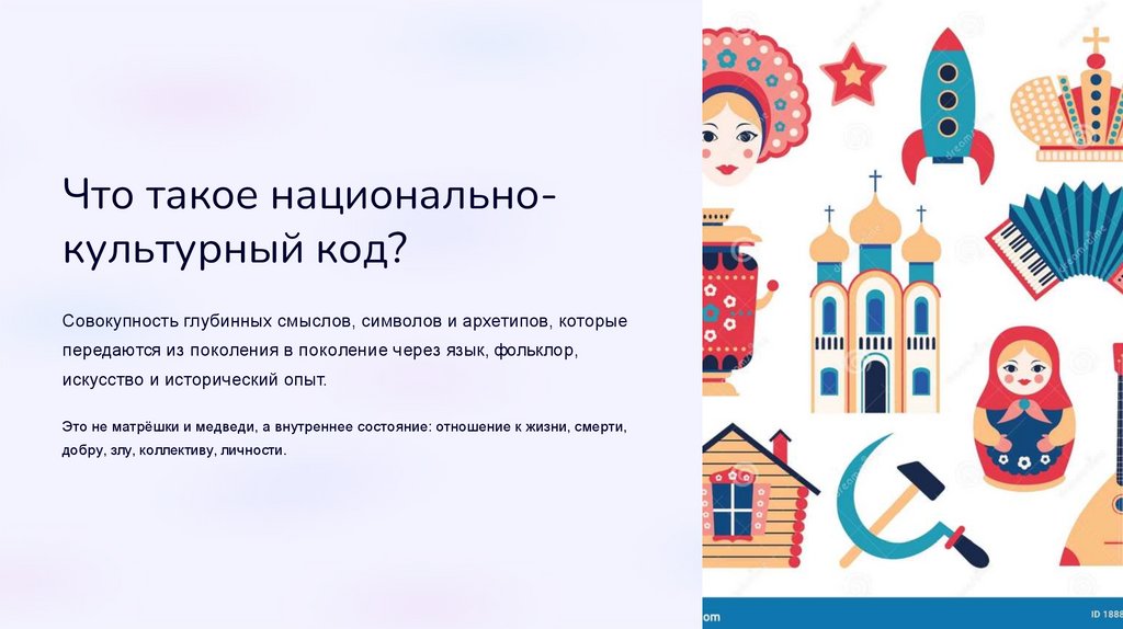 Что такое национальнокультурный код?Совокупность глубинных смыслов, символов и архетипов, которые