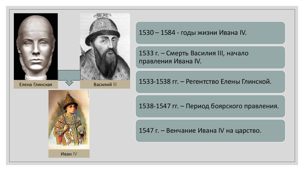 1530 – 1584 - годы жизни Ивана IV.1533 г. – Смерть Василия III, начало