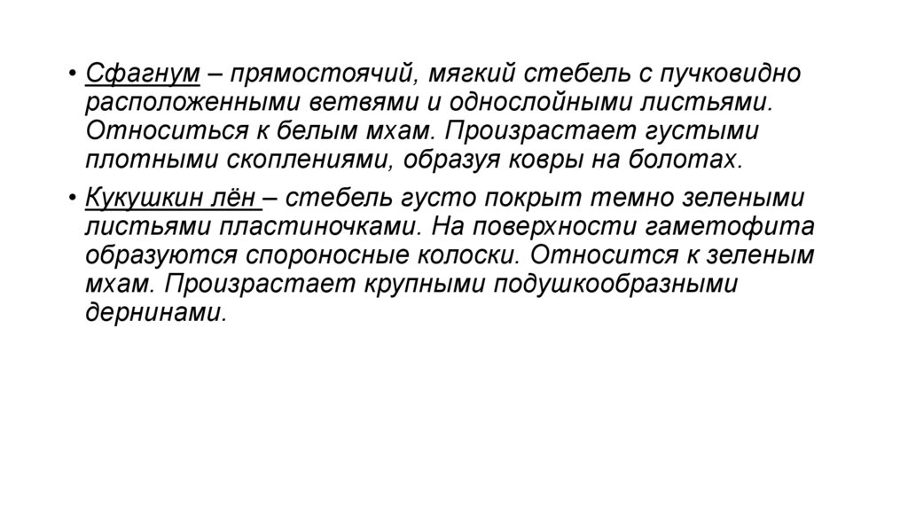 • Сфагнум – прямостоячий, мягкий стебель с пучковиднорасположенными ветвями и однослойными листьями.