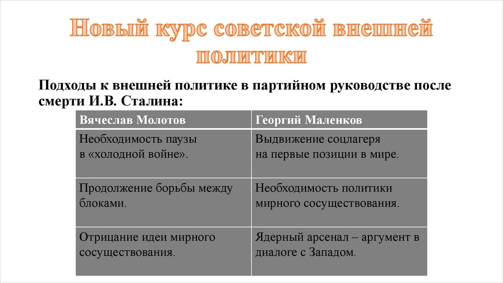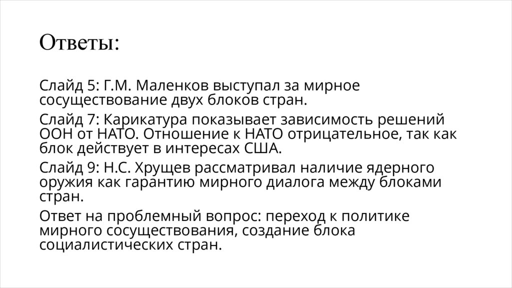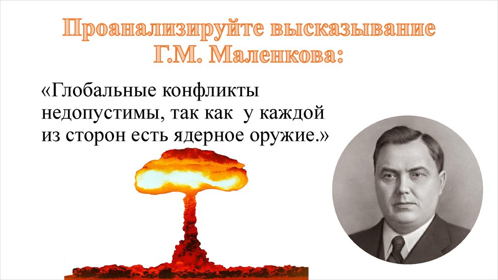 Ответы:Слайд 5: Г.М. Маленков выступал за мирное