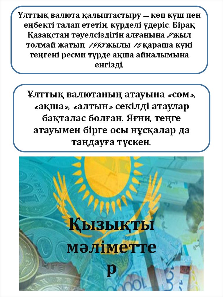 Ұлттық валюта қалыптастыру — көп күш пенеңбекті талап ететін, күрделі үдеріс. Бірақ