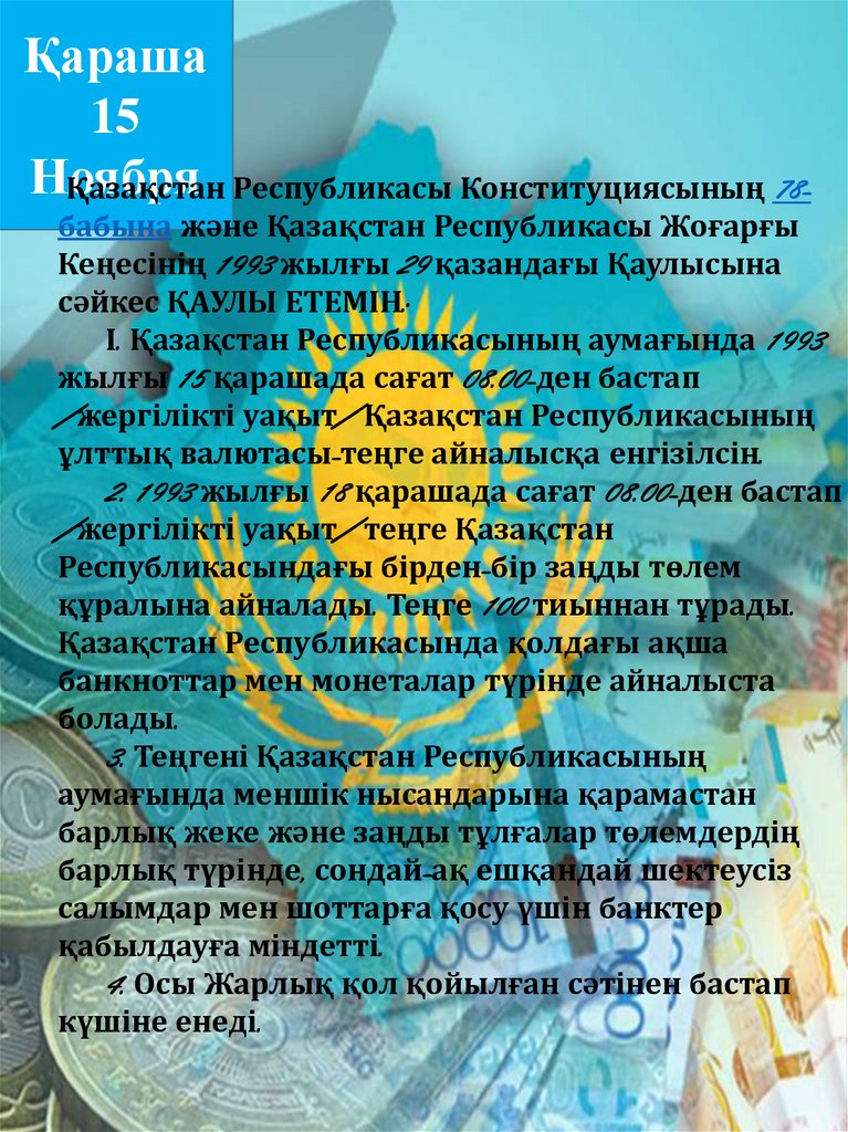ұлттық валютасы-теңге айналысқа енгізілсін.