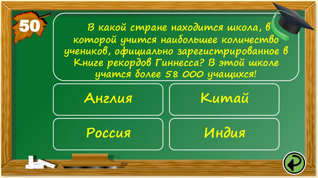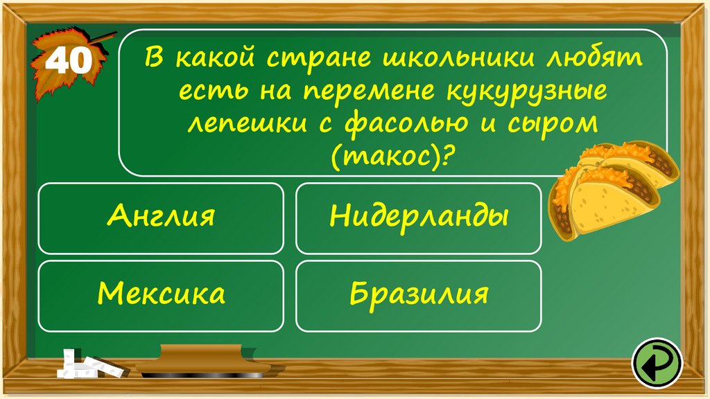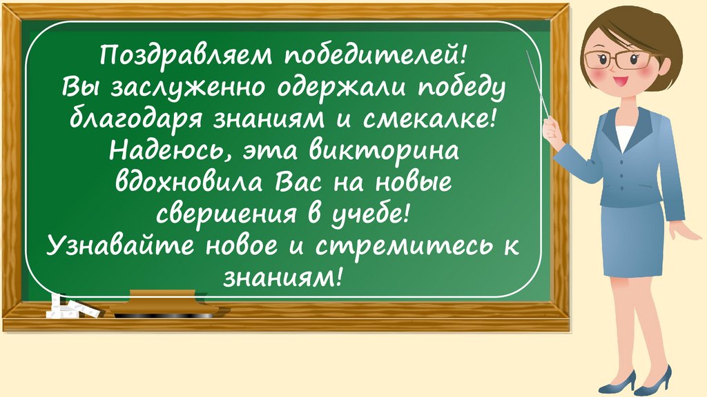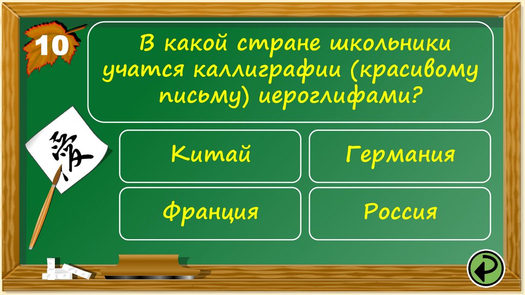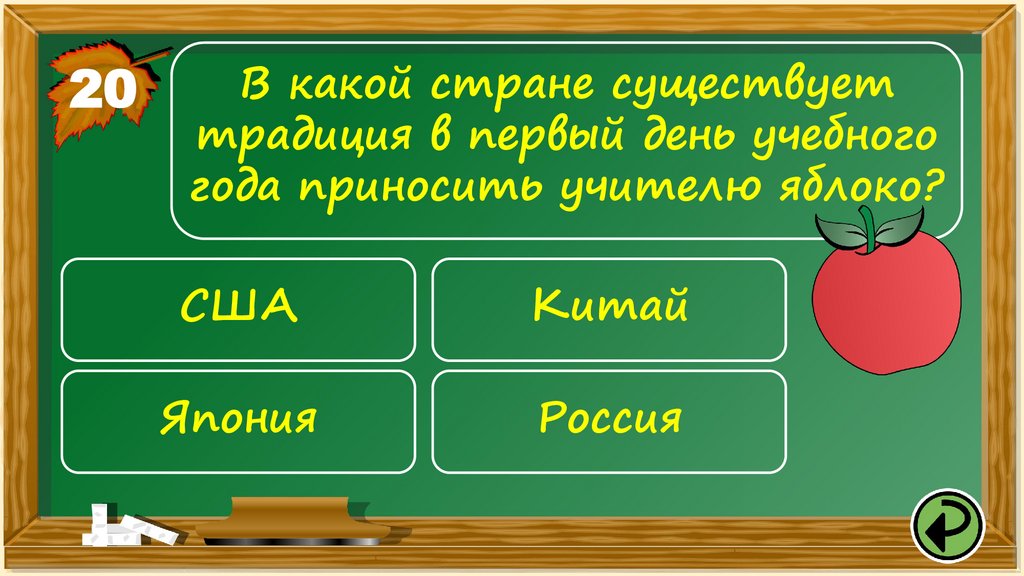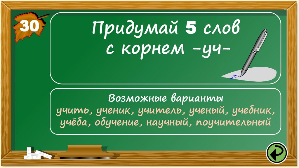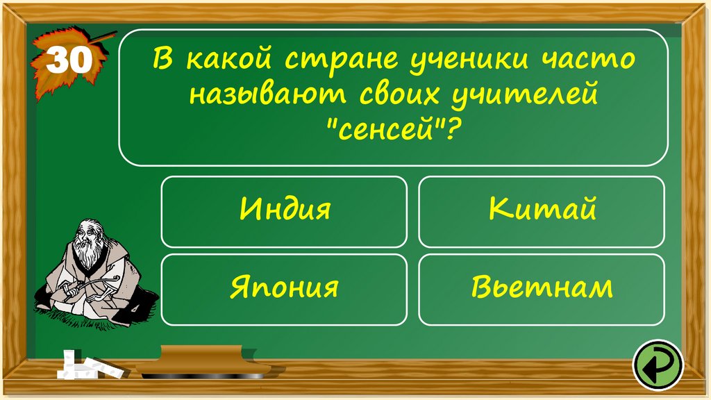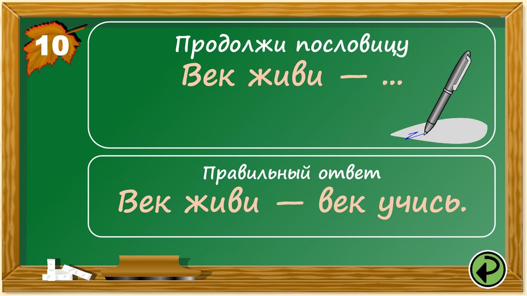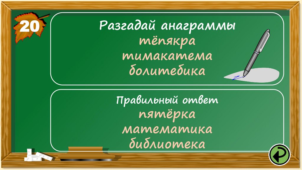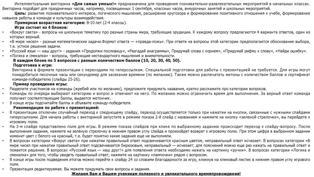 В конце игры после подведения итогов можно перейти к слайду 24 со словами благодарности за игру, кликнув на кленовый листик в нижнем правом углу игрового