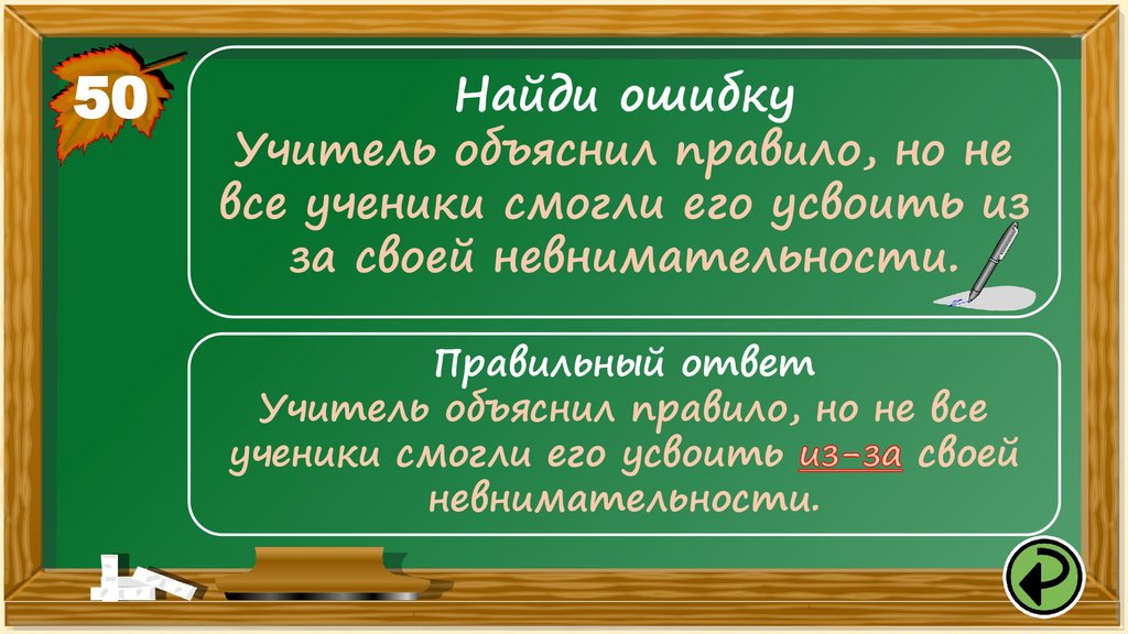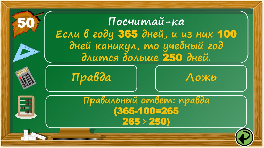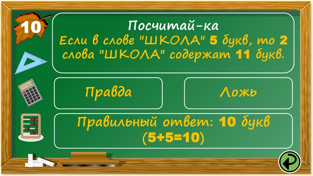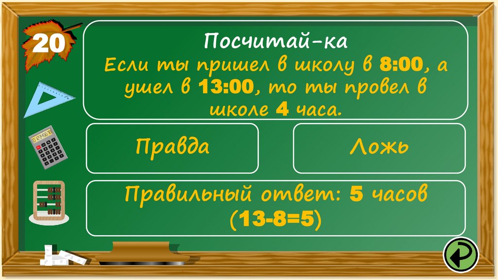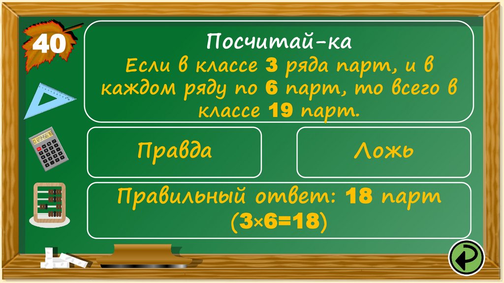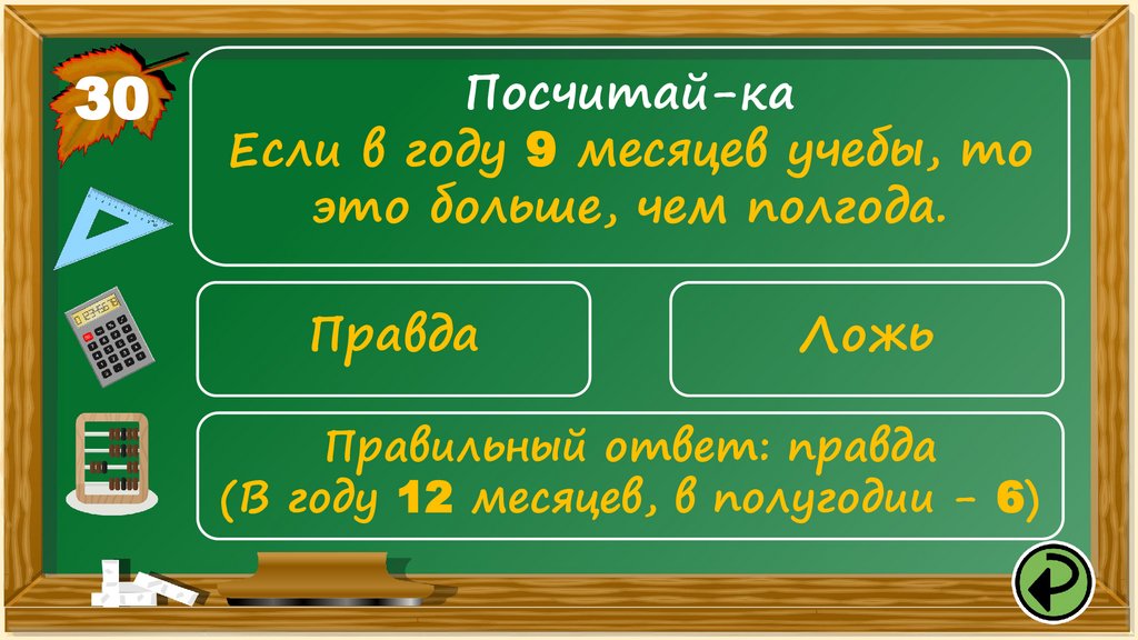 выполнения задания, нажмите на зелёную стрелочку в нижнем правом углу слайда и произойдет возврат к игровому полю. При этом цифра в выбранном задании