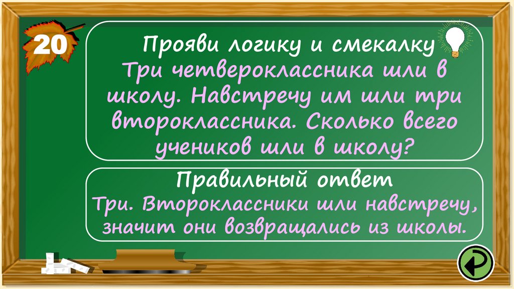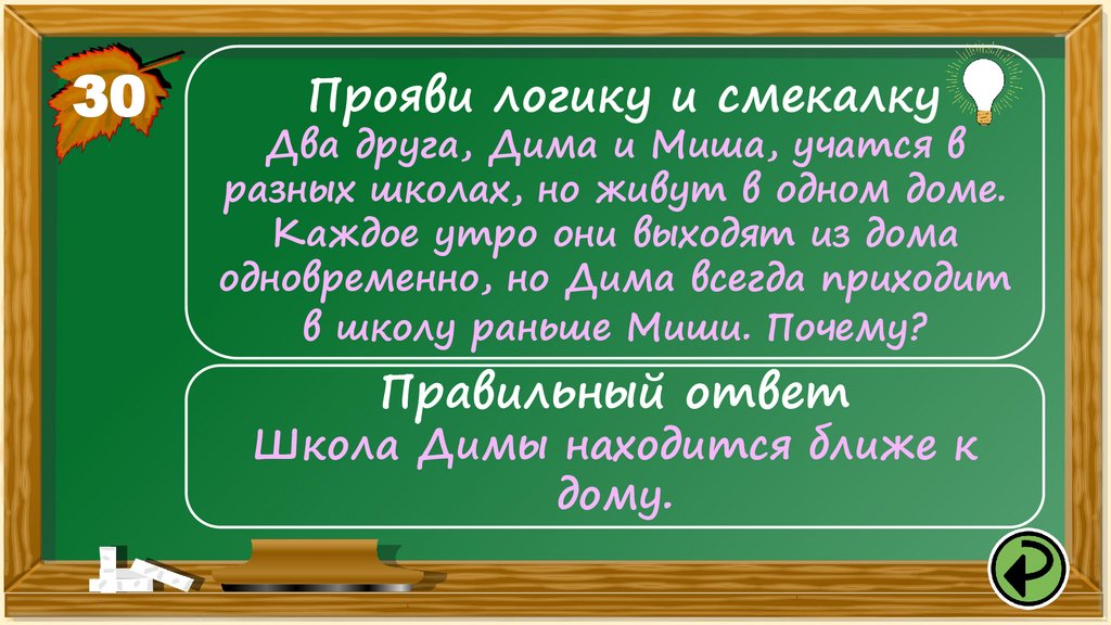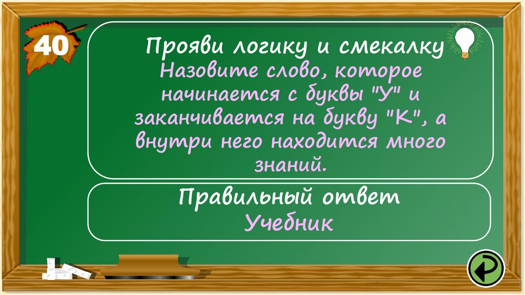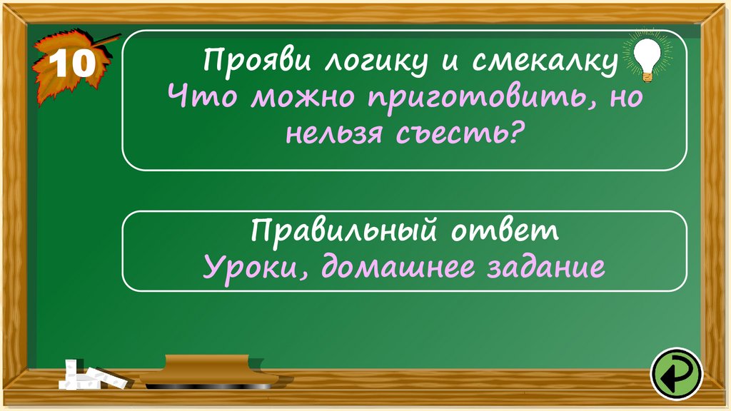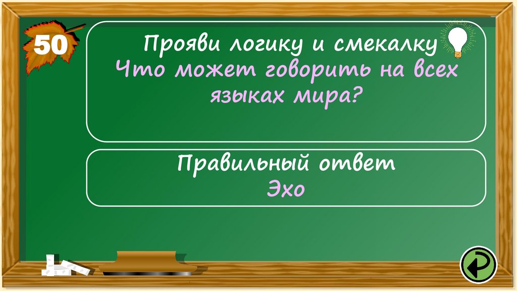 смекалка» для того, чтобы увидеть правильный ответ, нажмите на картинку «лампочки» рядом с вопросом.