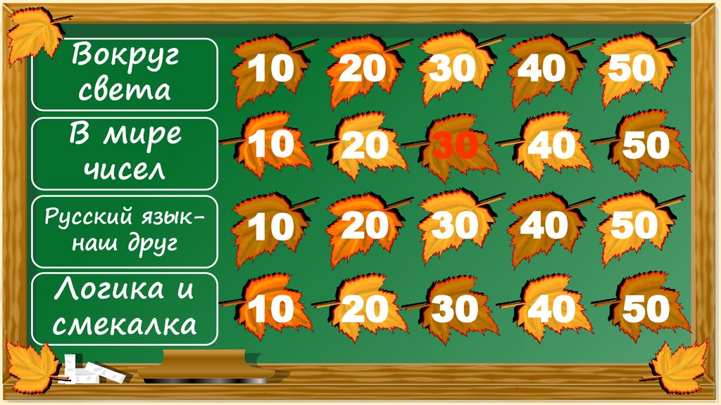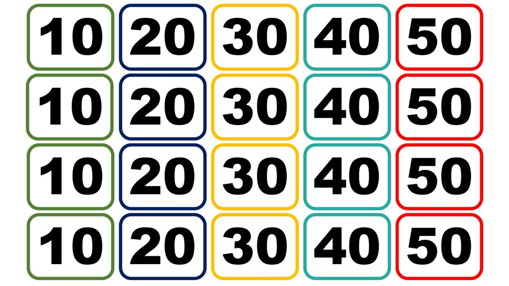 В каждом блоке по 5 вопросов с разным количеством баллов (10, 20, 30, 40, 50).