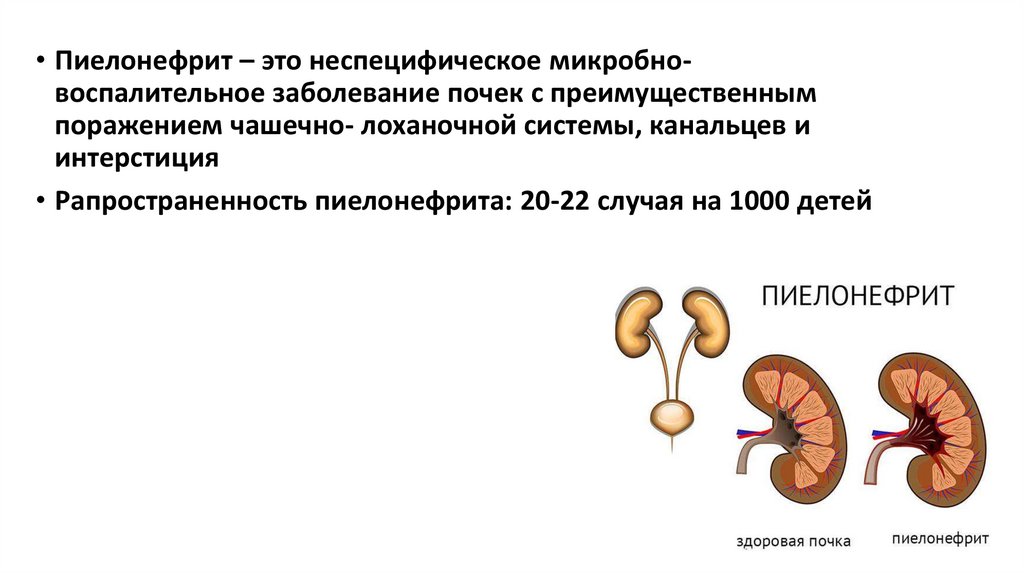 • Пиелонефрит – это неспецифическое микробновоспалительное заболевание почек с преимущественнымпоражением чашечно- лоханочной системы, канальцев и