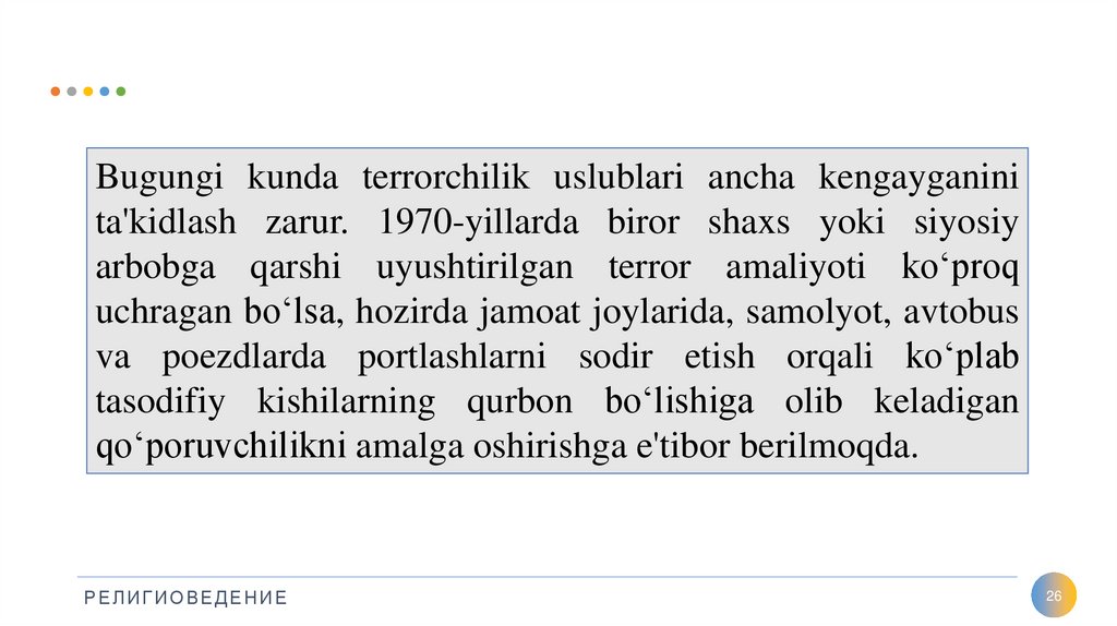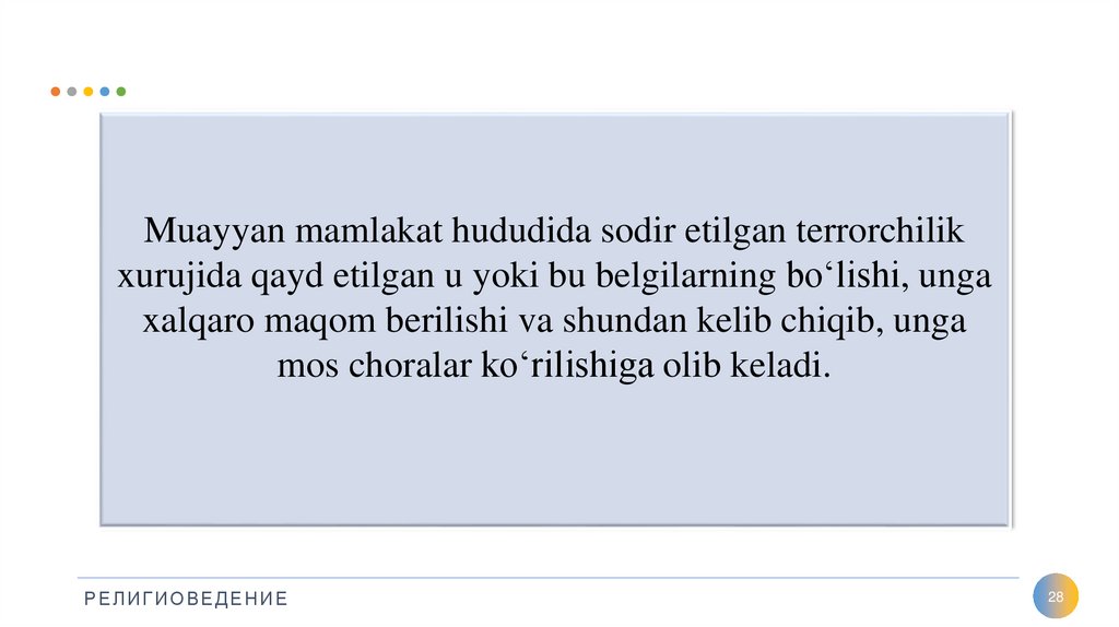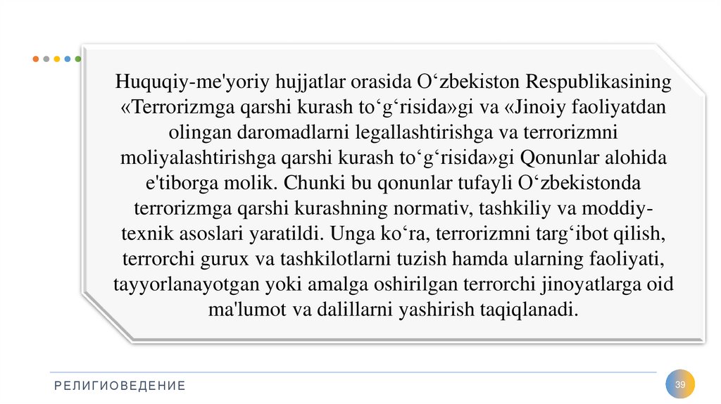 «…terrorizm – siyosiy, diniy, mafkuraviy va boshqa maqsadlarga erishish uchunshaxsning hayoti, sog‘ligiga xavf tug‘diruvchi, mol-mulk va boshqa moddiy