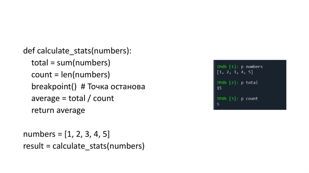 • Вызывает отладчик Python - встроенная функция в Python(доступна с версии 3.7), которая предоставляет удобный способ