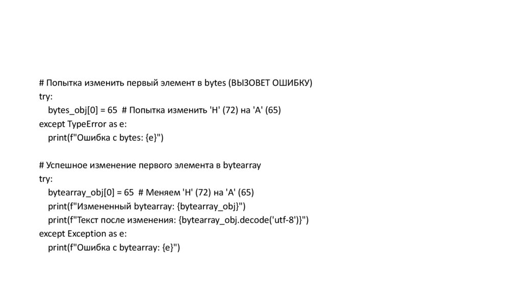 bytearray_obj[0] = 65 # Меняем 'H' (72) на 'A' (65)