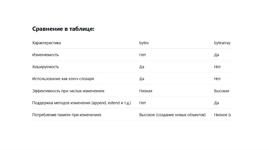 • Создает неизменяемую последовательность байт.print(bytes([65, 66, 67])) # b'ABC'