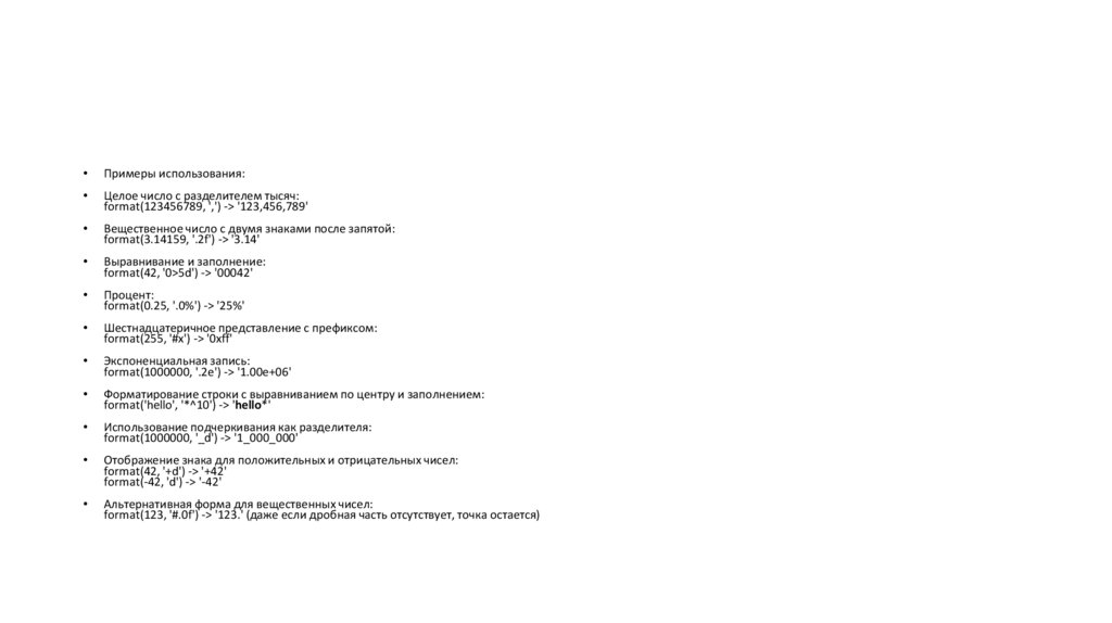 Форматирует значение по спецификации.print(format(123, '05d')) # '00123'