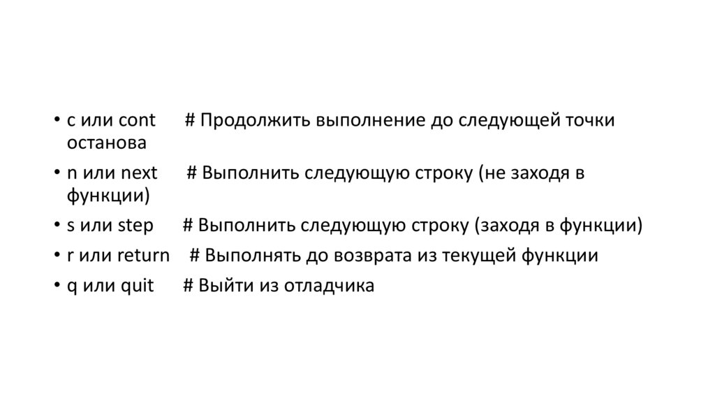 • c или cont # Продолжить выполнение до следующей точкиостанова