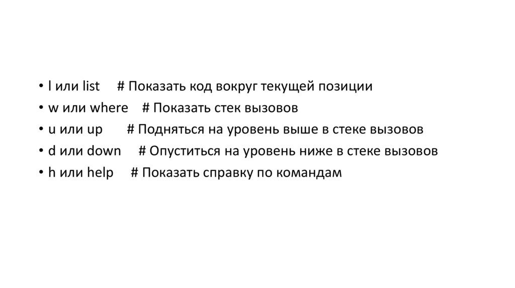 • l или list # Показать код вокруг текущей позиции• w или where # Показать стек вызовов