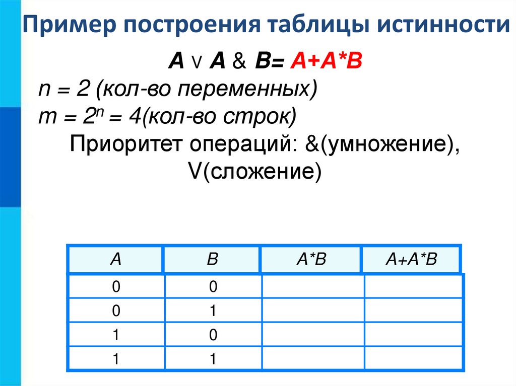Пример построения таблицы истинностиА V A & B= А+А*В