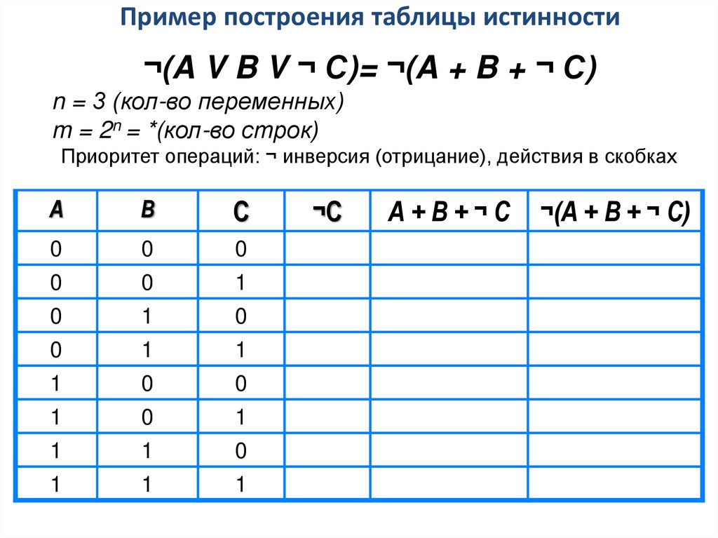 Пример построения таблицы истинности¬(A V B V ¬ С)= ¬(A + B + ¬ С)