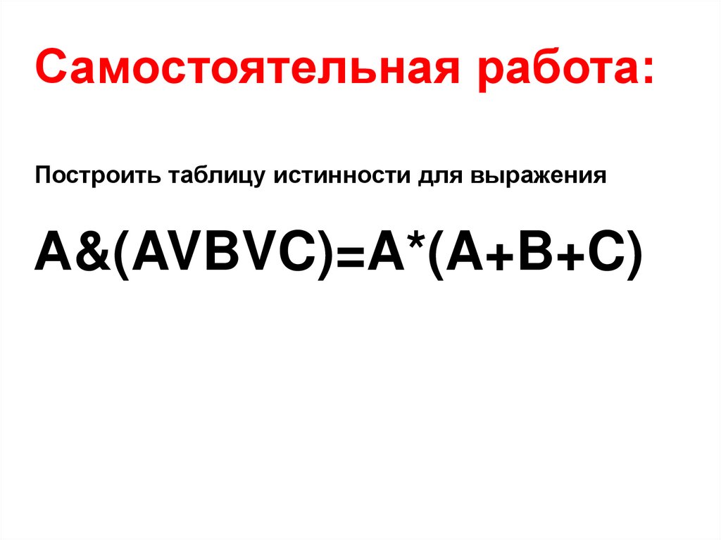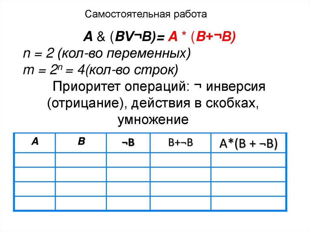 Самостоятельная работаA & (BV¬B)= A * (B+¬B)