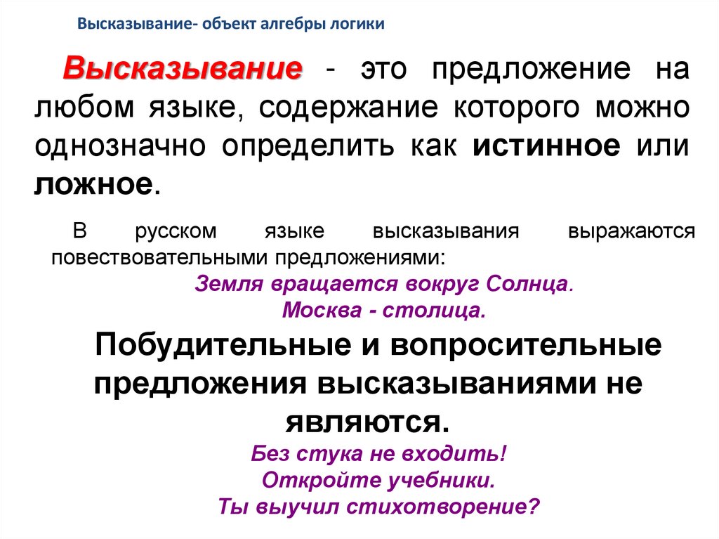 Высказывание- объект алгебры логикиВысказывание - это предложение на