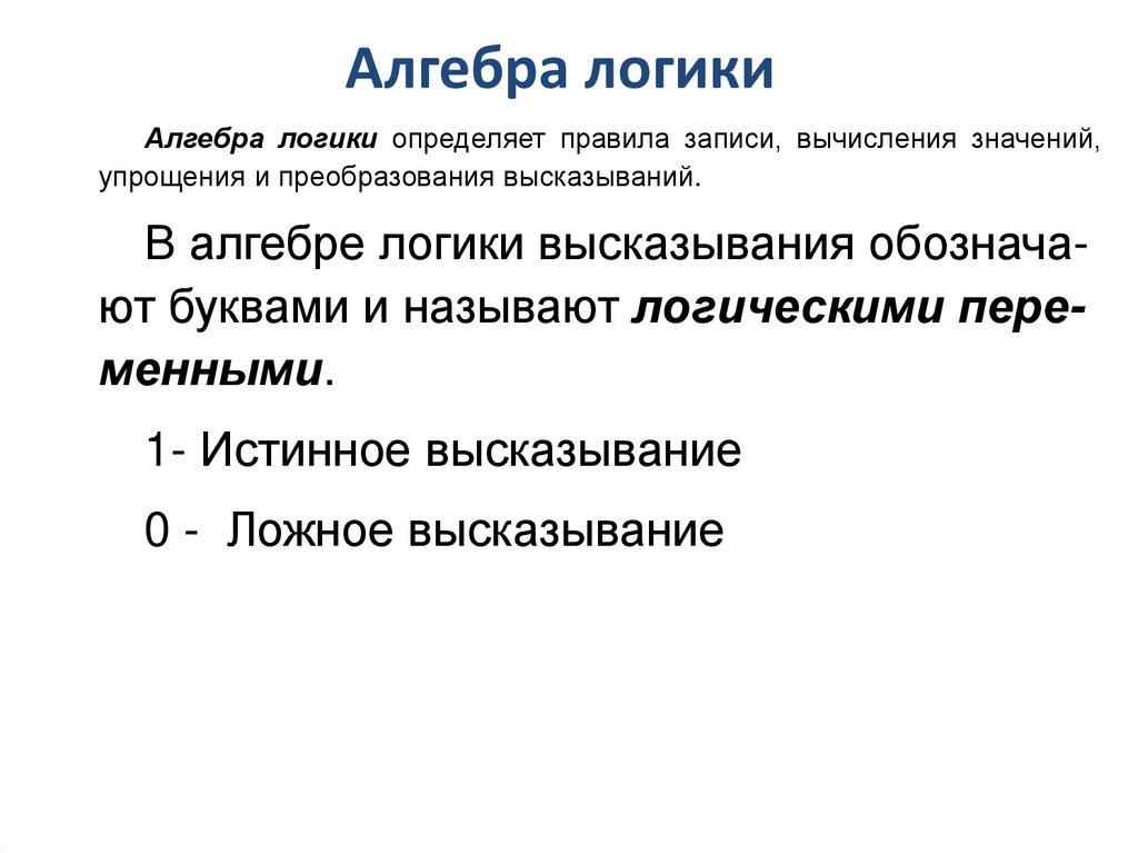 Алгебра логикиАлгебра логики определяет правила записи, вычисления значений,