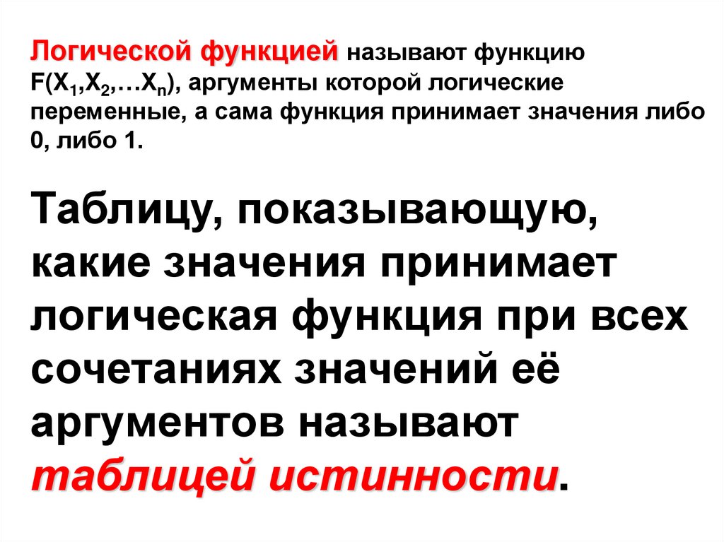 Логической функцией называют функциюF(X1,X2,…Xn), аргументы которой логические