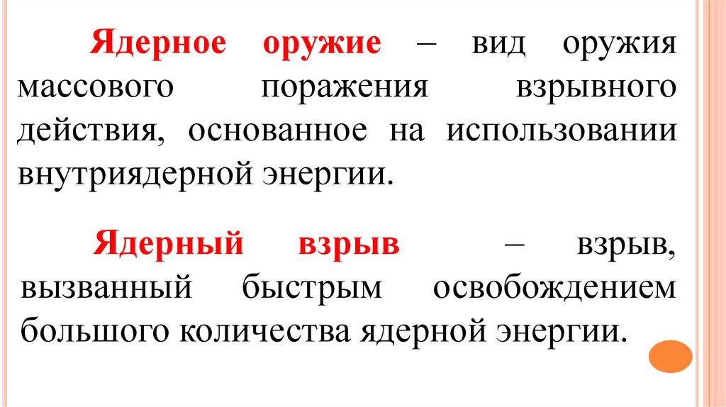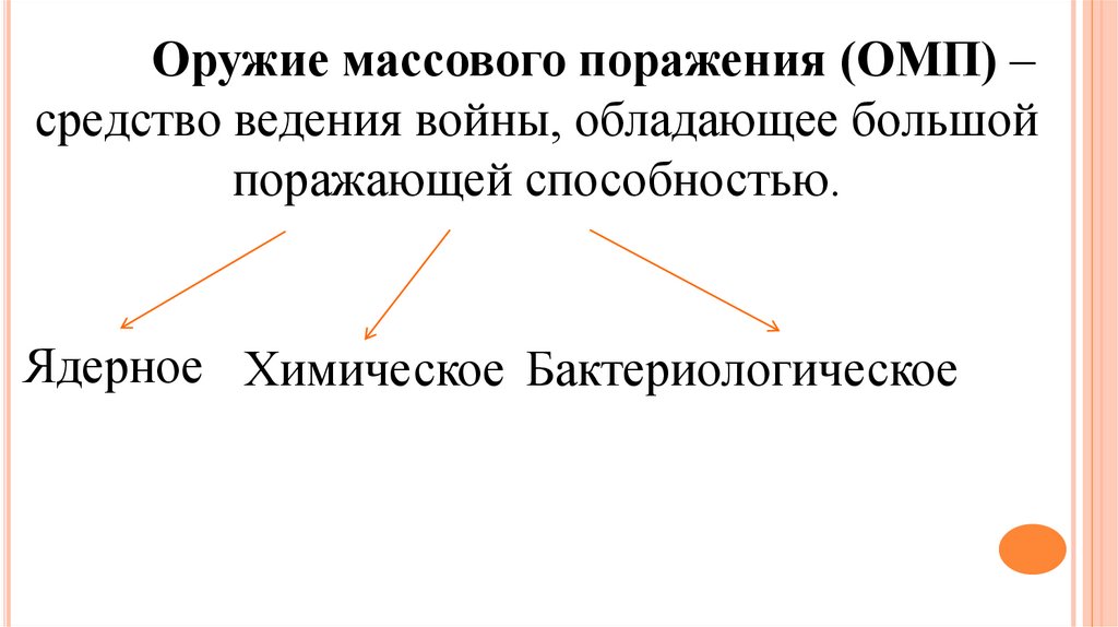 Оружие массового поражения (ОМП) –средство ведения войны, обладающее большой