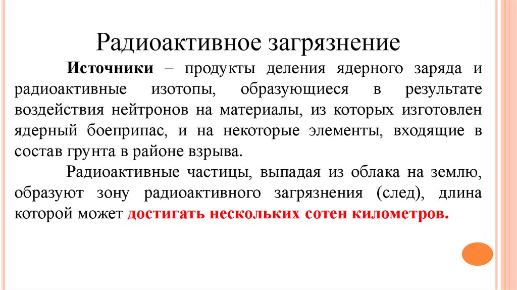 Радиоактивное загрязнениеИсточники – продукты деления ядерного заряда и