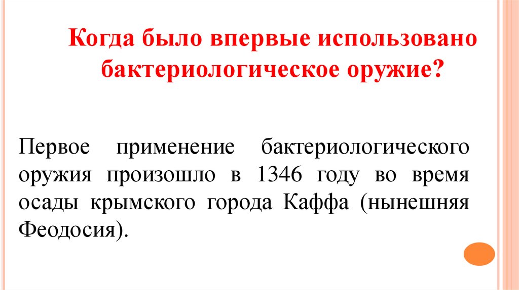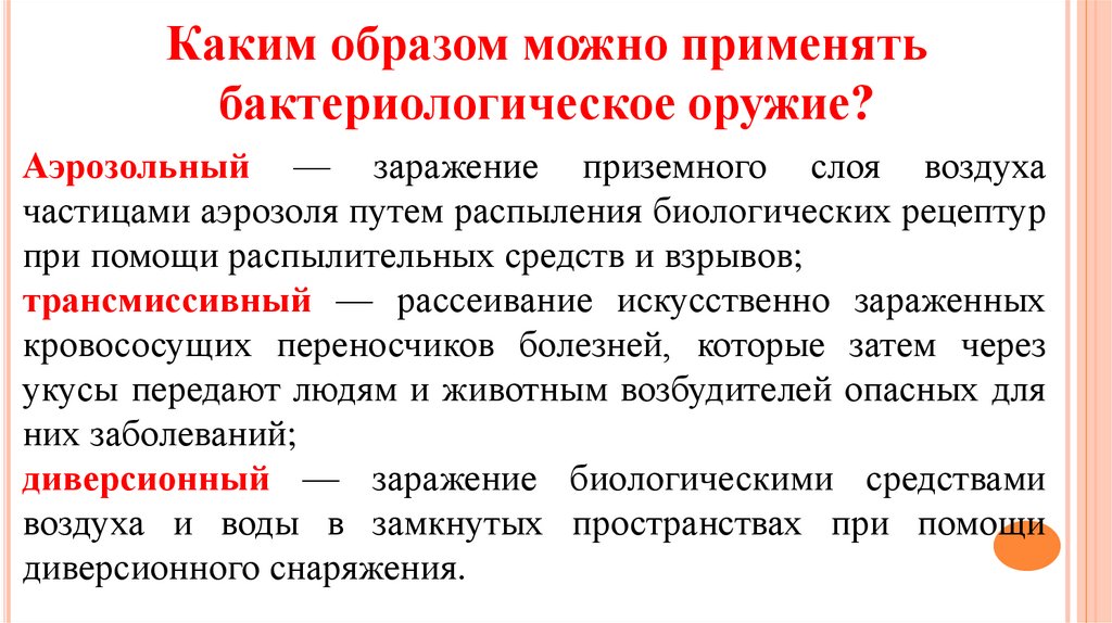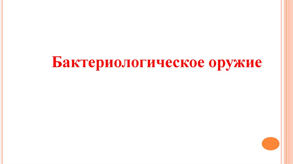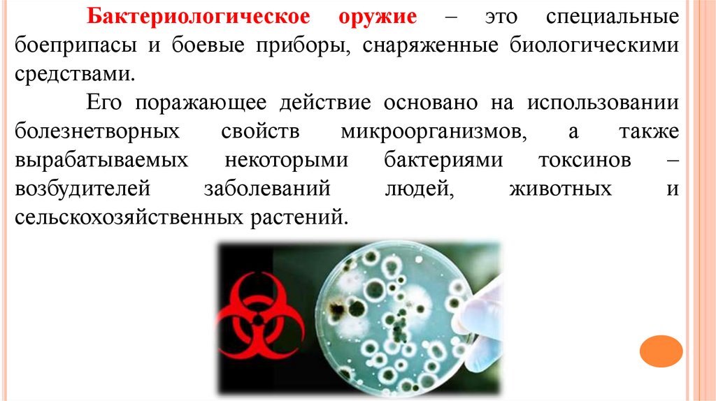 Бактериологическое оружие – это специальныебоеприпасы и боевые приборы, снаряженные биологическими