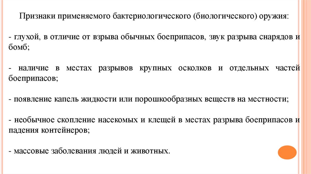 Признаки применяемого бактериологического (биологического) оружия:- глухой, в отличие от взрыва обычных боеприпасов, звук разрыва снарядов и