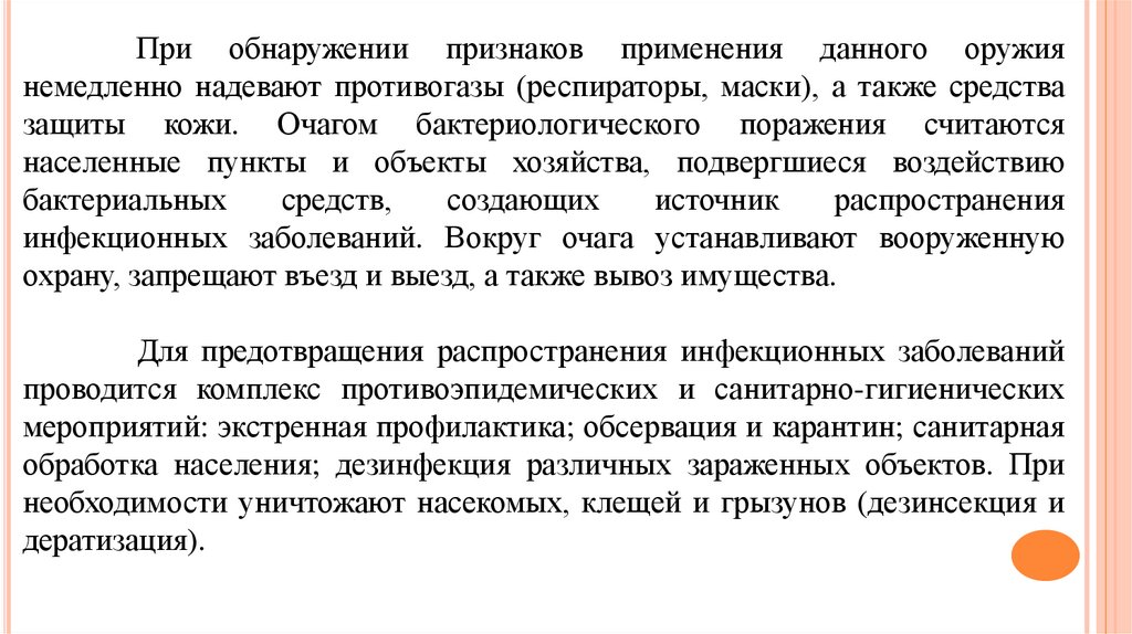 При обнаружении признаков применения данного оружиянемедленно надевают противогазы (респираторы, маски), а также средства