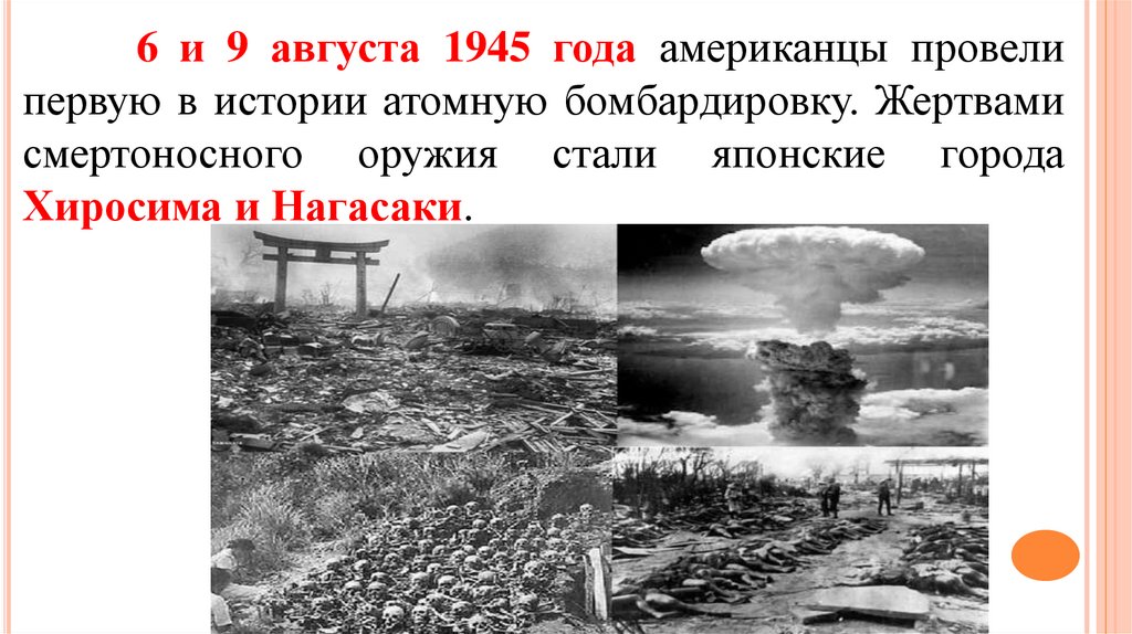 6 и 9 августа 1945 года американцы провелипервую в истории атомную бомбардировку. Жертвами