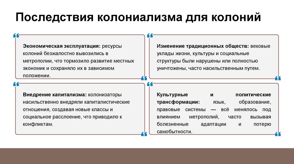 Последствия колониализма для колонийЭкономическая эксплуатация: ресурсы